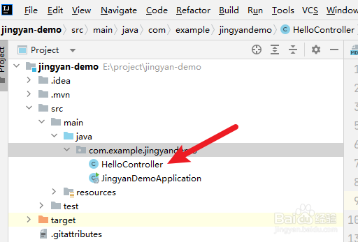 1/10项目创建完成后,你会看到左侧的项目结构。找到这个核心文件:src/main/java/com/example/jingyan/JingyanDemoApplication.java。