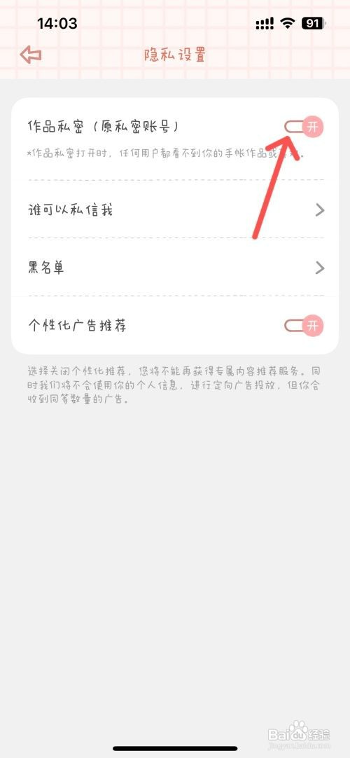 [图]4/4如下,在隐私设置中,将【作品私密】后的按钮开启即可