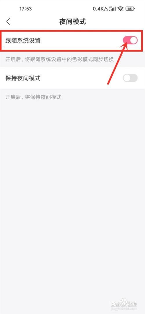 [图]3/3进入到夜间模式设置界面,打开“跟随系统设置”开关即可。