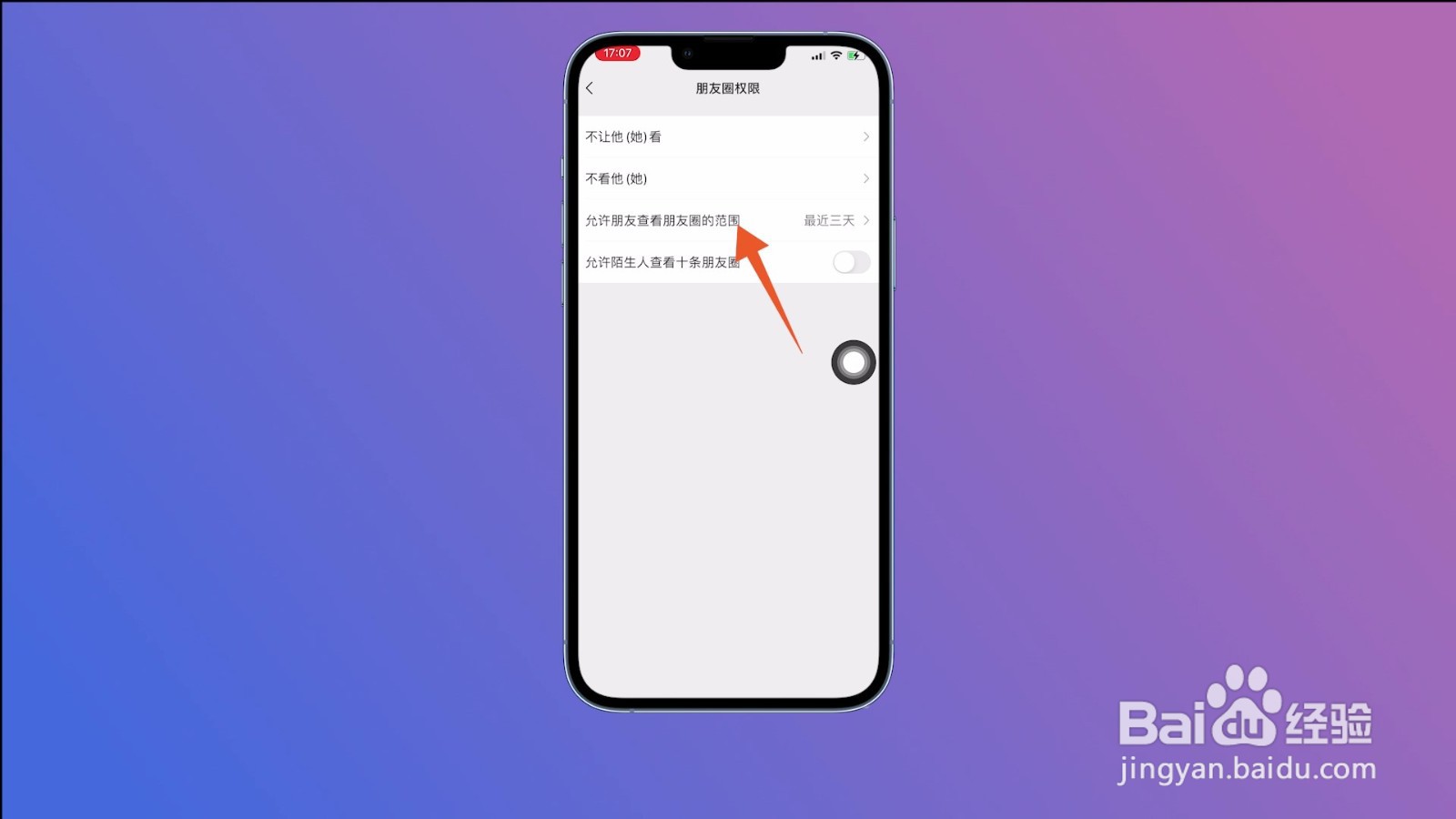 在朋友圈权限设置界面中,选择【允许朋友查看朋友圈的范围】并点击。