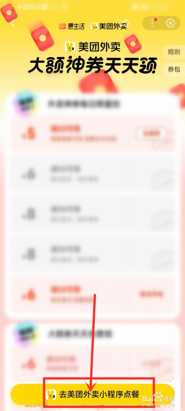 [图]2/5进入到外卖红包领取页,点击页面底部“去美团外卖小程序点餐”。