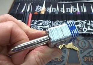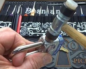 这种是最老式而且最常见的铜芯锁,一般用钥匙扭一下锁头就会弹出来,那么接下来就是要看看是如何用锤子撬开锁的。