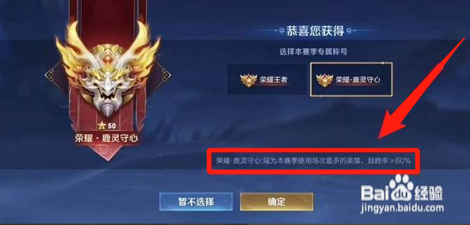 此时可以看到,要想获得鹿灵守心称号,只要“荣耀鹿灵守心瑶为本赛季使用场次最多英雄,且胜率大于等于60%”即可。