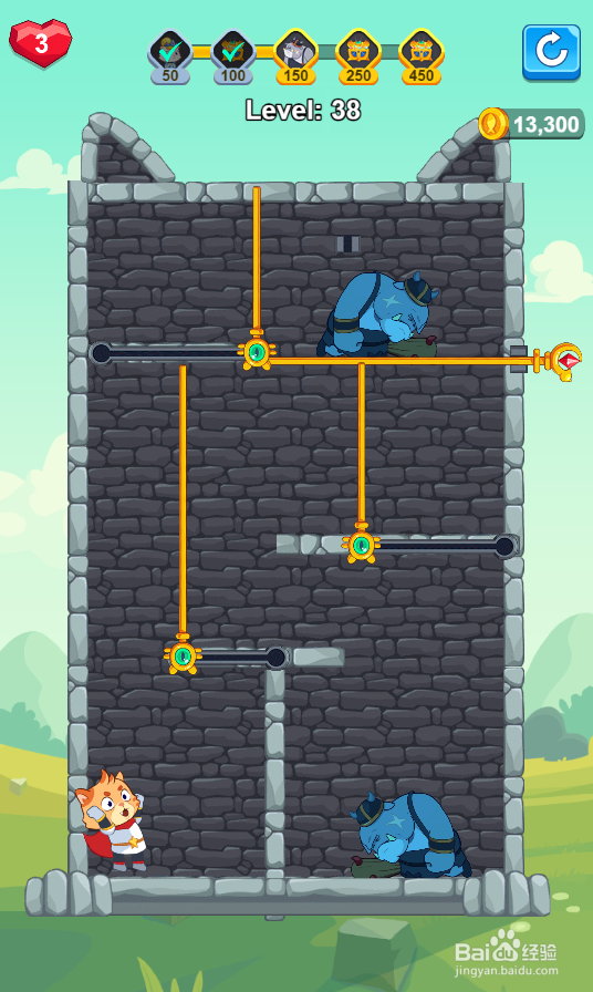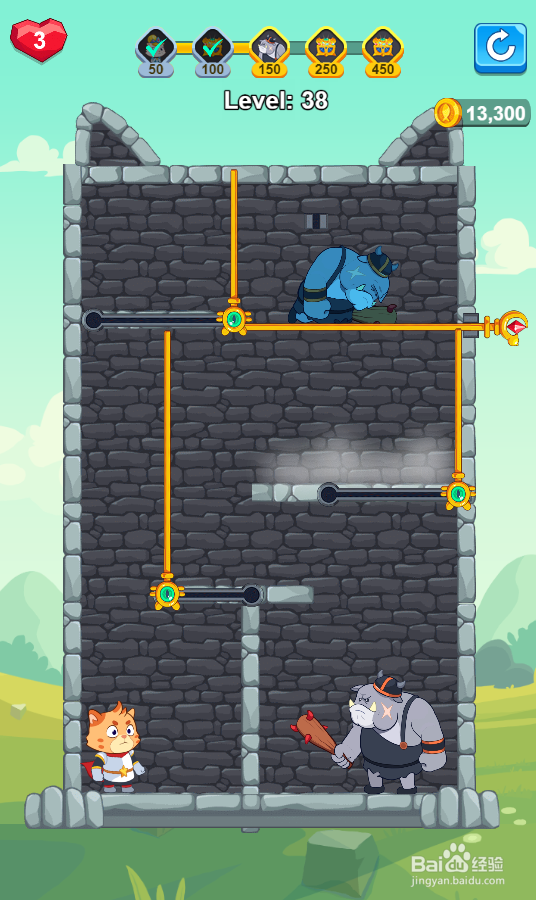 1/6分步阅读这一关的任务是消灭两个狗匪徒,猫勇士站在左侧底部,白色气体在右上侧,里面有两个拉针、三个推拉杆,如图。