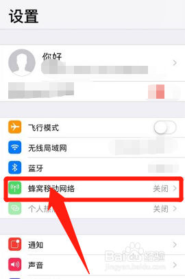 打开手机设置进入界面后,选择蜂窝移动网络点击进入。