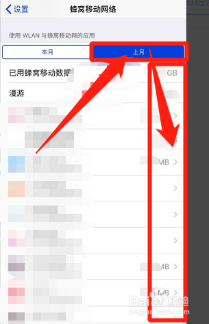 进入蜂窝移动网络界面后,点击上月查看上月应用使用的实时流量数据。