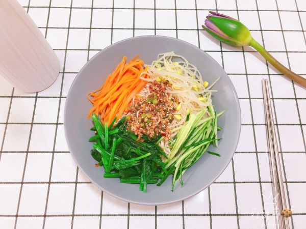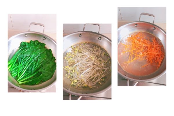 [图]4/7锅中烧开水,将胡萝卜丝、豆芽 焯一下水后过凉水沥干水分备用。菠菜焯水过凉水后挤干水份切成段备用。