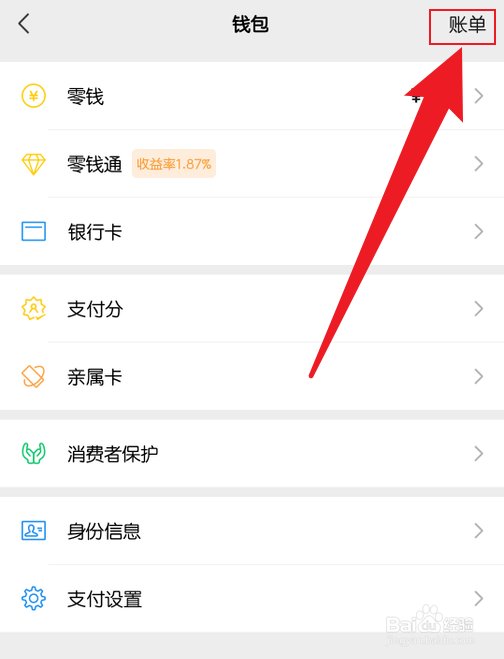1/3分步阅读打开微信中的钱包界面,点击右上方的账单选项。