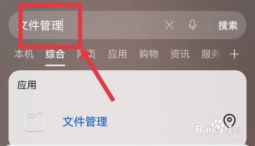 在手机任意界面非顶部下滑屏幕,在出现的页面中的输入栏输入文件管理。