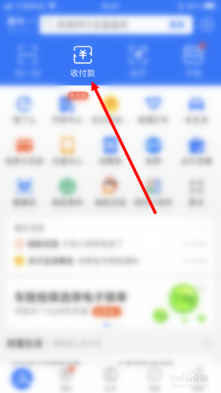 1/3分步阅读首先在手机上打开并登录支付宝,并在首页面点击【收付款】。