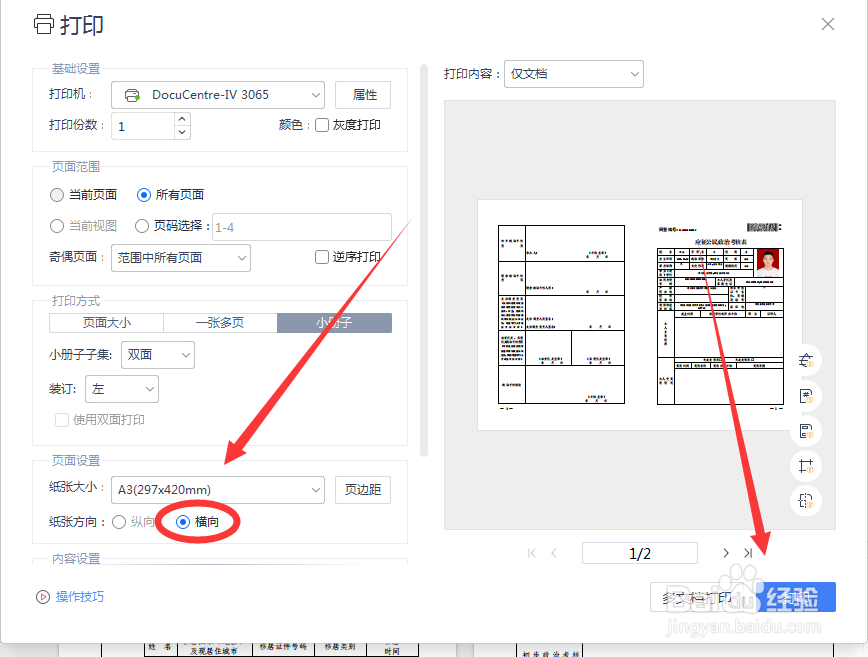 [图]4/4第四步:纸张方向选择【横向】,点击【打印】