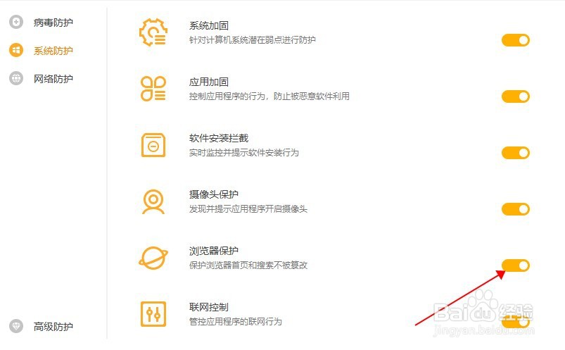 [图]4/5进入系统防护的页面,找到浏览器保护。