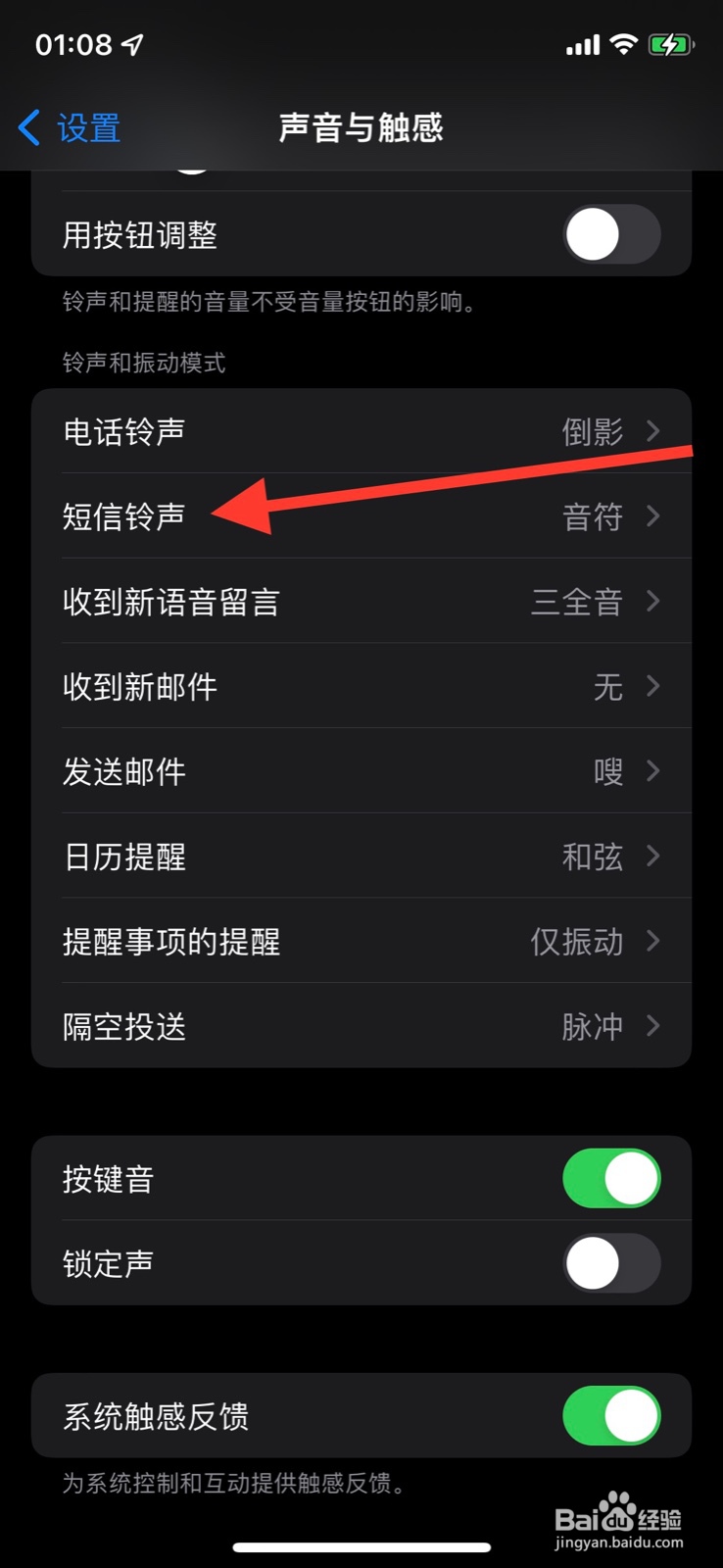 下滑“声音与触感”显示页面点击“短信铃声”。