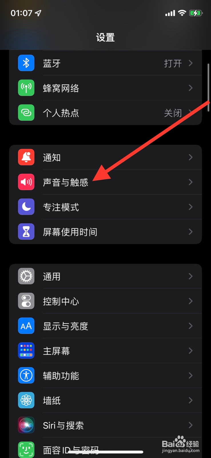 手机“设置”页面下滑点击“声音与触感”。