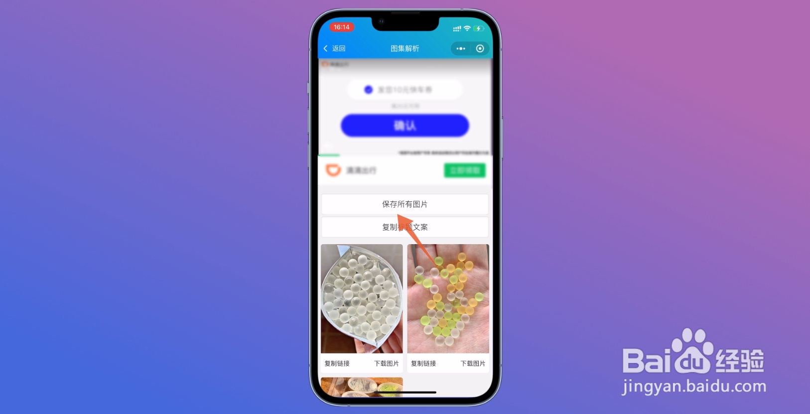 在图集解析的页面中,点击屏幕中间的保存所有图片,就可以成功去除水印。另外微信去水印的小程序非常多,但是操作步骤都是一样的。