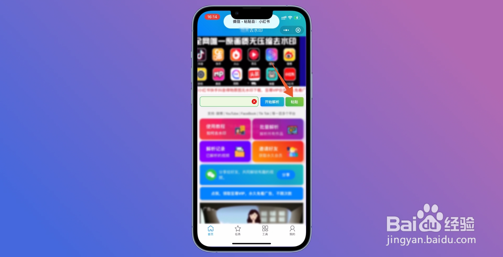 接着打开微信中的去水印小程序,点击右边的粘贴功能,选择开始解析。