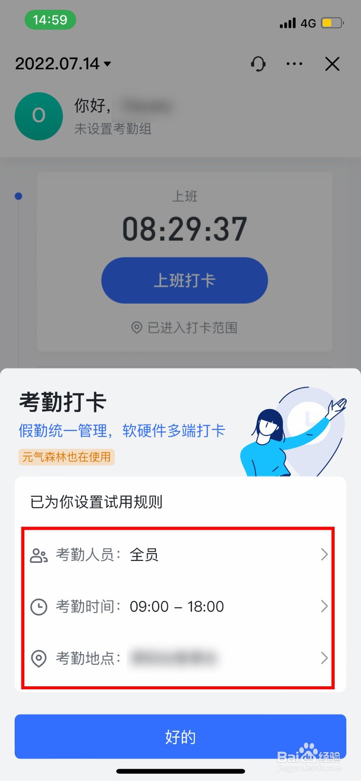 [图]3/3在打开的弹窗中,设置考勤时间和地点,再点击【好的】即可。