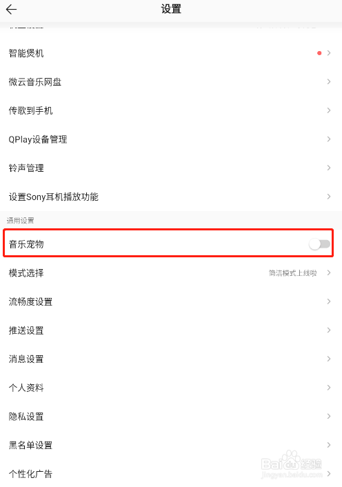 [图]4/7打开如下图界面,滑动手机屏幕,选择音乐宠物选项,点击关闭后面的开关