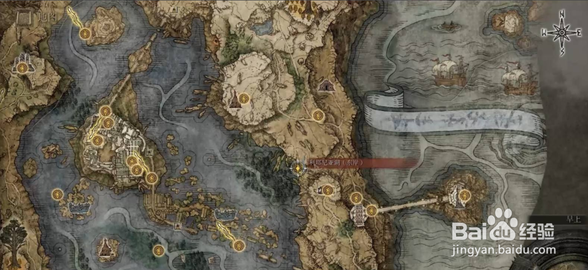 [图]进入到游戏中,进入艾尔登法环游戏后打开地图,前往利耶尼亚湖东岸。