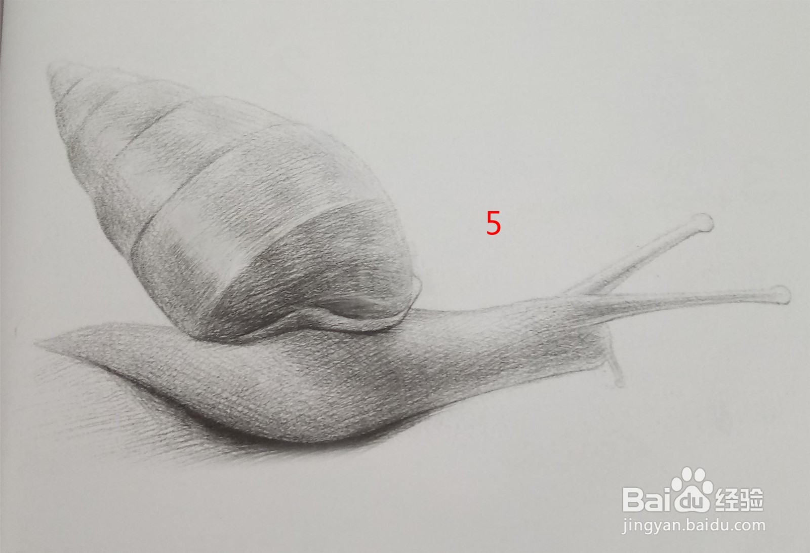 [图]4/5步骤4:继续加深画面中的暗部和阴影,增强立体感,同时通过高光和反光的区别,区分开蜗牛身体和蜗牛壳的质感。如下图所示